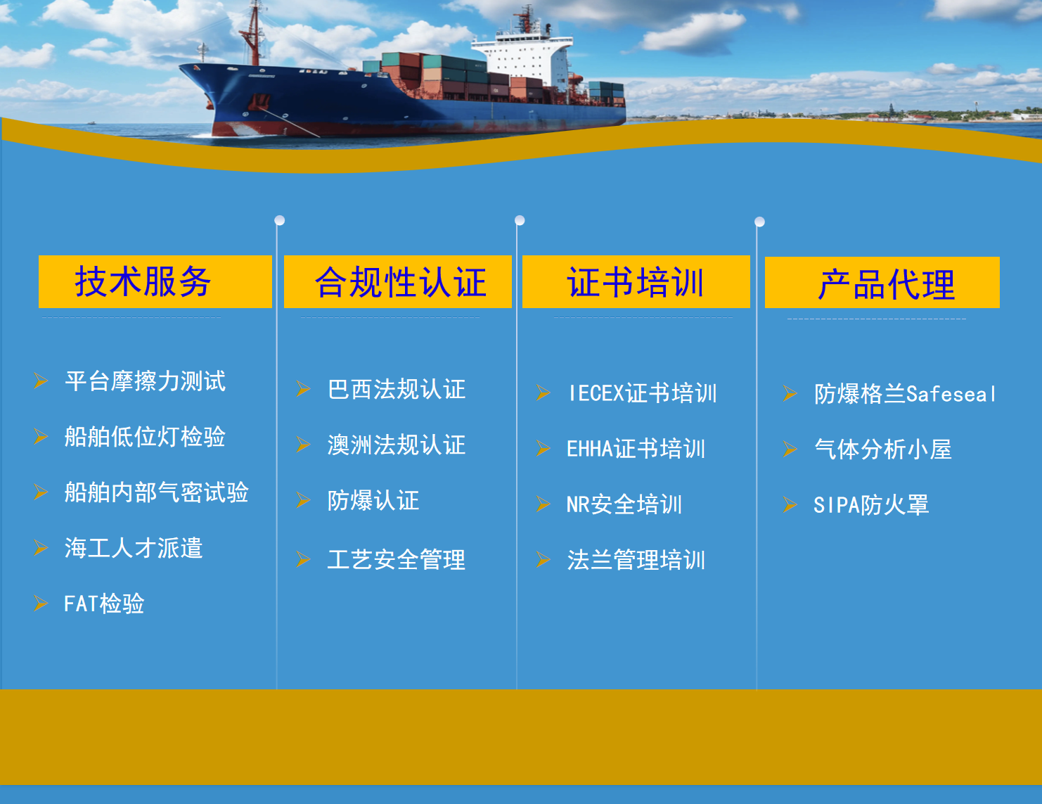 上海蒂沙科技有限公司成立于2017年,中国公司位于上海市浦东新区临港新片区。公司的主要业务是向海洋工程和石油化工行业提供巴西法规NR检验、DPC检验、直升机平台摩擦力测试、船舶低位灯带检验、澳洲产品认证、防爆产品认证、工厂设备验收检验、IECEx电气设备安装、法兰管理服务、IECEx防爆电气培训、EEHA培训、NR培训、海工人才派遣服务等相关业务。同时也做相关产品代理配套服务,如防爆格兰safeseal、气体分析小屋、SIPA工业防火罩等特殊工业产品。公司与多个国内外大型海洋工程装备制造企业均有相关领域的合作,公司自成立以来已成功交付了多个国内外大型海洋装备项目的技术服务。